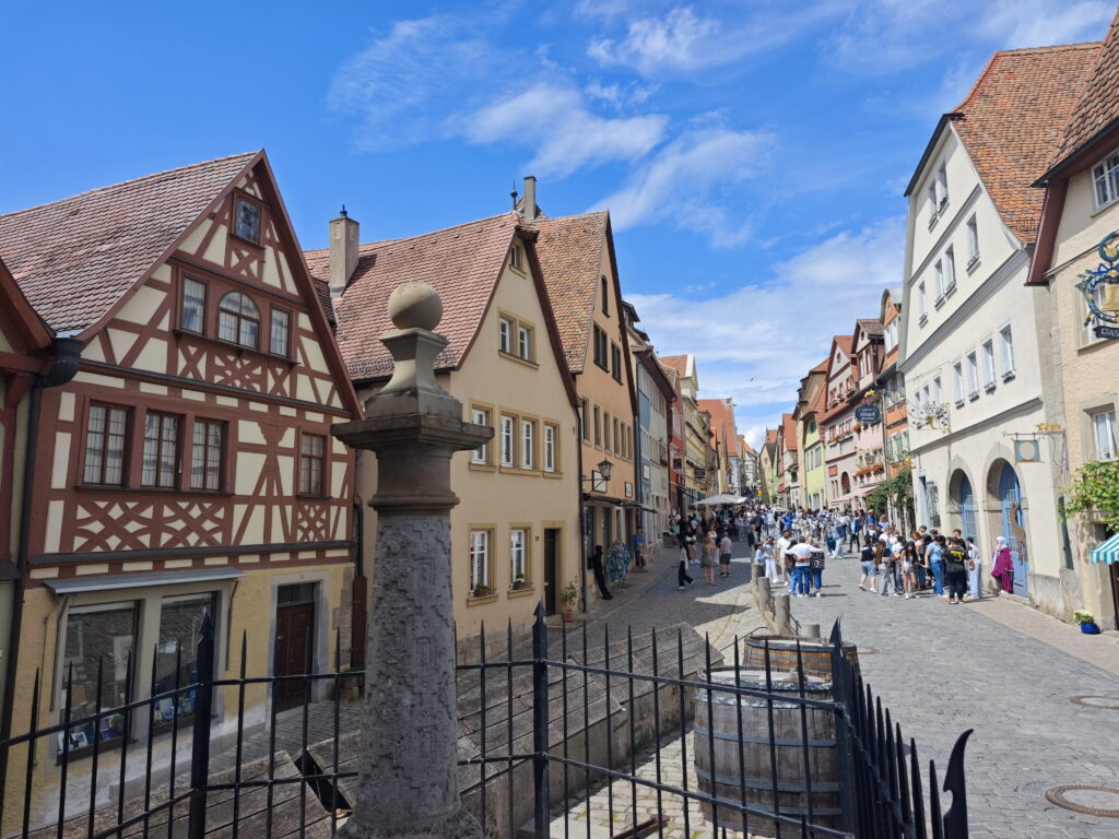 Wenn du vor dem berühmten Plönlein in Rothenburg ob der Tauber stehst – eingerahmt von dem gelben Fachwerkhäuschen, dem Siebersturm zur linken und dem Kobolzeller Tor zur rechten – dann fällt dein Blick unweigerlich auf den Brunnen, der direkt an der Gabelung des Platzes steht. Viele gehen achtlos daran vorbei. Andere posieren kurz für ein Foto. Doch nur wenige wissen: Dieser Brunnen ist eines der funktional vielschichtigsten Elemente am Plönlein. Der Plönlein-Brunnen stammt aus dem Mittelalter und hatte eine zentrale Funktion in der öffentlichen Infrastruktur. In einer Zeit, in der es kein Leitungswasser gab, waren Brunnen lebensnotwendig. Doch dieser hier war noch mehr – er erfüllte gleich drei essenzielle Aufgaben, die bis heute noch an den Details seiner Bauweise ablesbar sind.